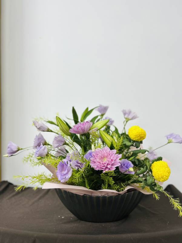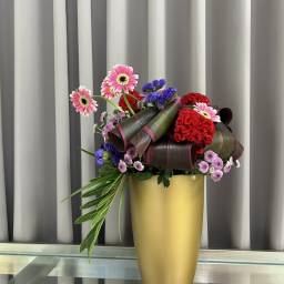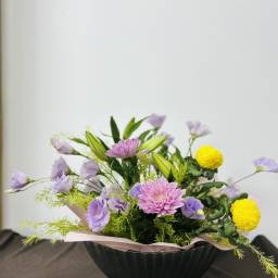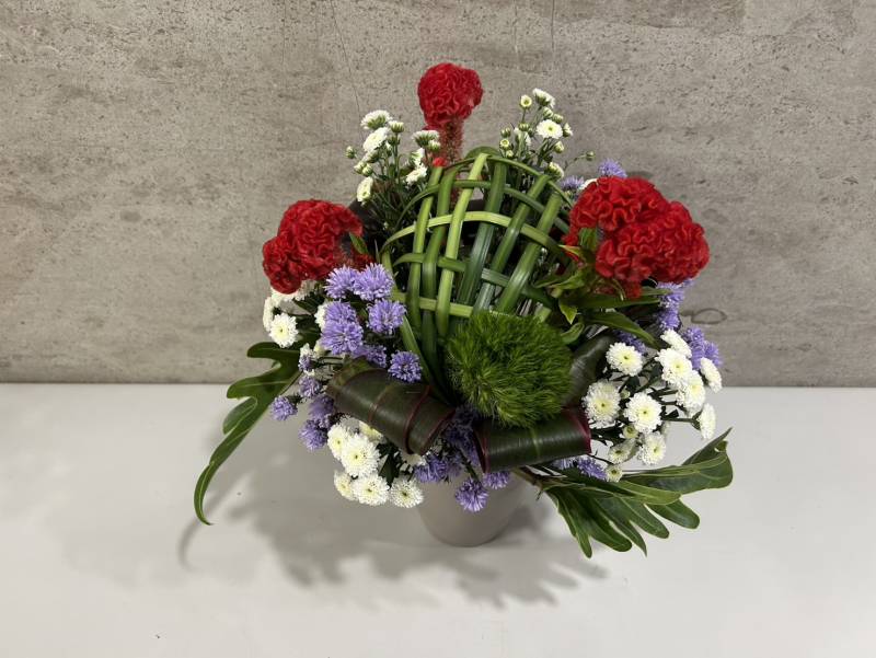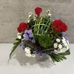 | 手綁花 | 花束可用不同方式呈現若以佳節送禮,此花型可花籃且用傅統不對稱三角型來詮釋。採用不同的比例來變化,將高度縮短,底部加長的變化方式來插作,感覺是一束花平置放在花藍中,再加上緞帶。 |